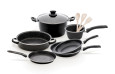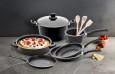Delimano prezanton Stone Legend Black All-in-One, setin e plotë prej 10 copësh që kombinon dizajn elegant, cilësi të lartë dhe funksionalitet maksimal. Me bazë të fortë çeliku karboni dhe shtresë Quantanium® me grimca të vërteta guri dhe titaniumi, këto enë ruajnë nxehtësinë dhe e shpërndajnë gradualisht te ushqimi, duke mbajtur lagështinë, vitaminat dhe aromën natyrale.